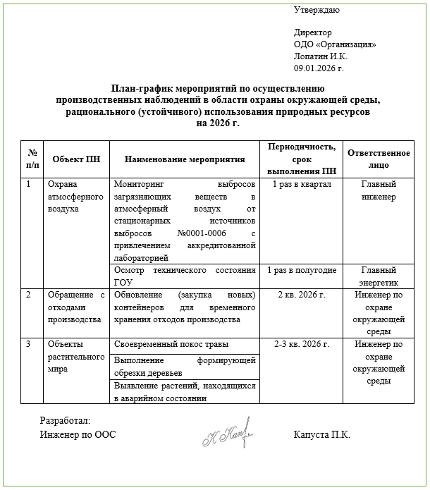 В соответствии с требованиями раздела «Планирование и проведение производственных наблюдений» (п. 7 постановления № 52) инструкция по осуществлению ПН должна содержать порядок организации проведения ПН, который включает планирование мероприятий по осуществлению ПН (планы-графики, планы мероприятий и др.). При этом законодательно не установлена форма таких планов-графиков, сроки их создания и действия. Следовательно, природопользователь при разработке инструкции по осуществлению ПН вправе создать свои формы планов, утвердить их и в дальнейшем применять на практике. Как правило, план-график разрабатывается в начале календарного года, содержит объекты, подлежащие наблюдениям и мероприятия по их выполнению.