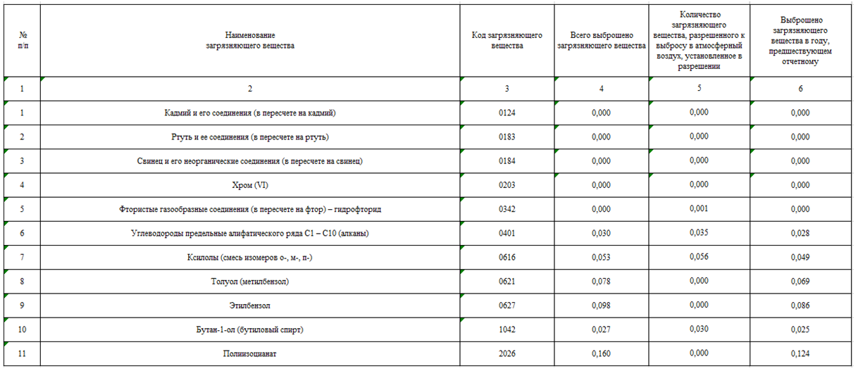В таблице 6 отражаются сведения о выбросах в атмосферный воздух от стационарных источников выбросов специфических загрязняющих веществ, индивидуальных ЛОС и тяжелых металлов и их соединений: