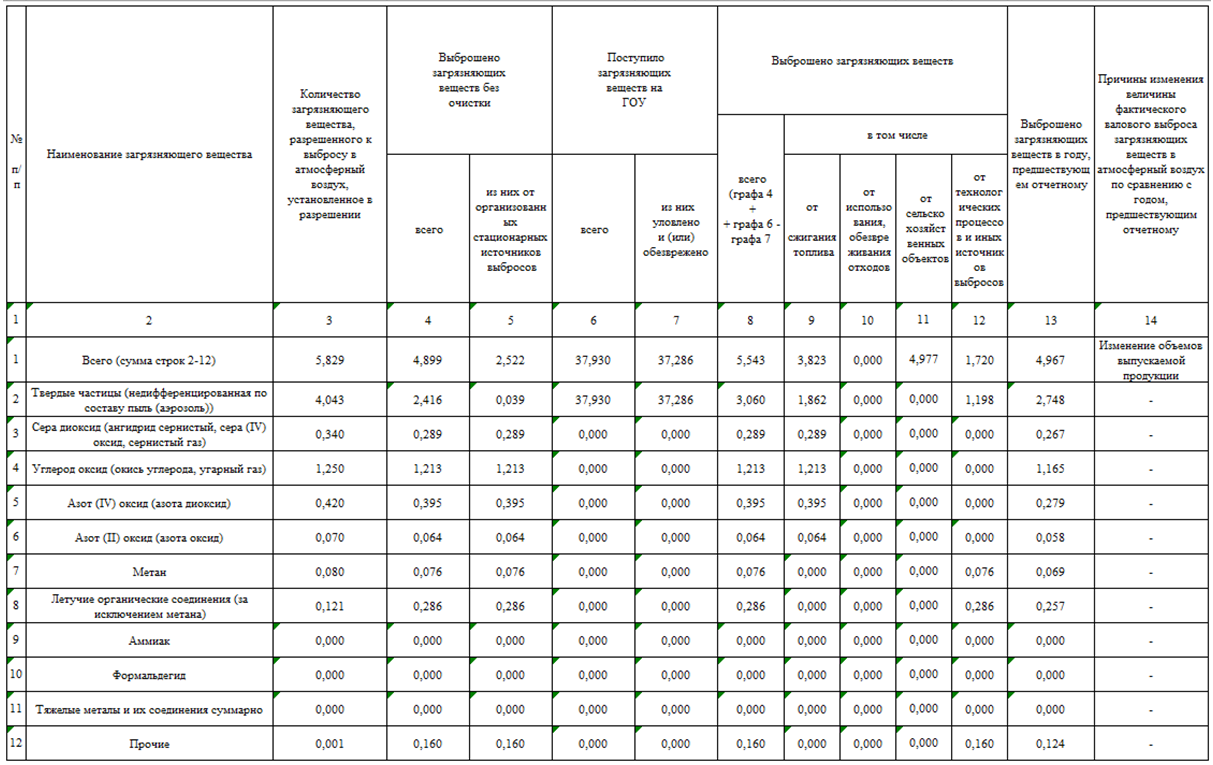 в графе 14 по строке 1 указывается причина, вызвавшая изменение (увеличение или уменьшение) фактического общего выброса загрязняющих веществ в атмосферу в отчетном году на 10% и более по сравнению с предыдущим годом.