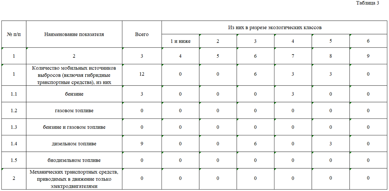 В таблице 3 отражаются сведения о количестве мобильных источников выбросов (механических транспортных средств, включая гибридные) по группам, учитывающим тип двигателя (транспортные средства, работающие на бензине, газовом топливе, бензине и газовом топливе, дизельном топливе, биодизельном топливе) и экологический класс. Также в таблице 3 указываются данные о количестве механических транспортных средств, приводимых в движение только электродвигателями. На балансе предприятия ОАО «Завод» числится 12 мобильных источников.