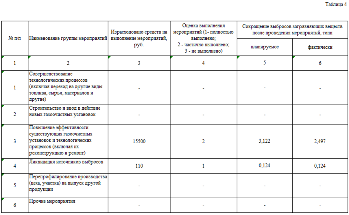 В таблице 4 отражаются данные о выполнении природопользователем в отчетном году мероприятий по уменьшению выбросов загрязняющих веществ в атмосферный воздух с указанием соответствующей оценки выполнения мероприятия в графе 4 данной таблицы.